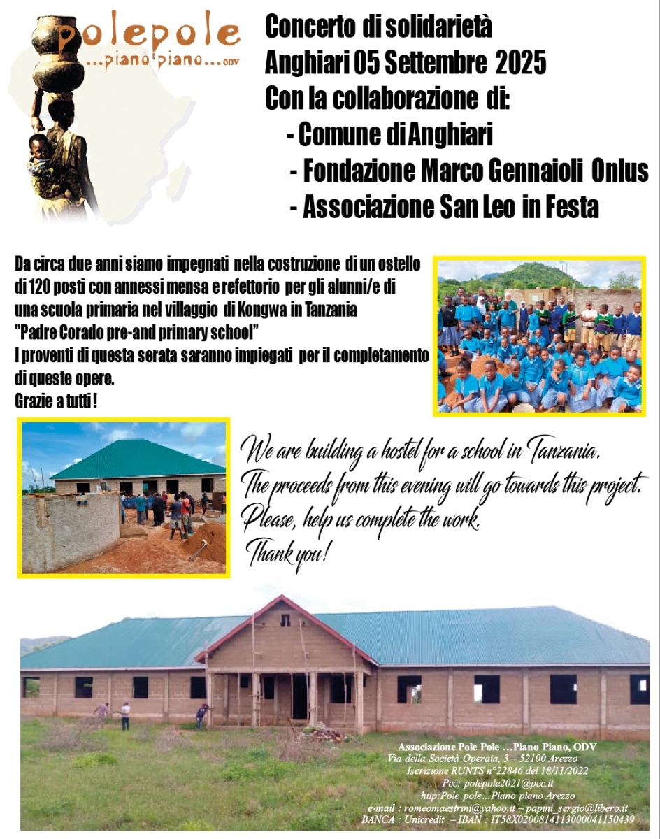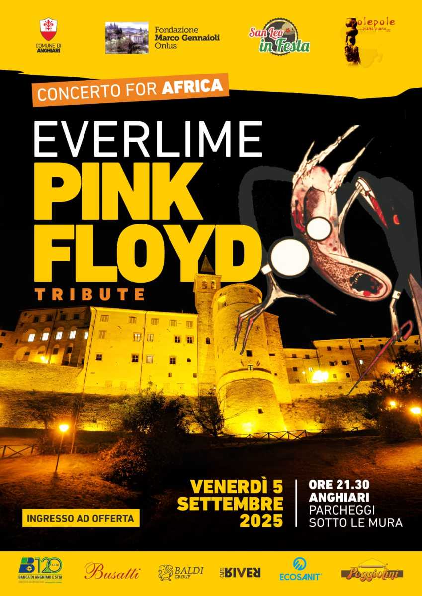 27 Agosto 2024 – L’ Associazione Pole pole… piano piano ed il comune di Sansepolcro hanno organizzano una serata all’insegna della musica “Concerto per L’Africa con il complesso Everlime Pink Floyd Tribute Band” il 27 agosto 2024, Piazza Torre di Berta Sansepolcro con sfondo benefico, per dare corpo a progetti di solidarietà l’intero ricavato sarà devoluto per questi progetti :